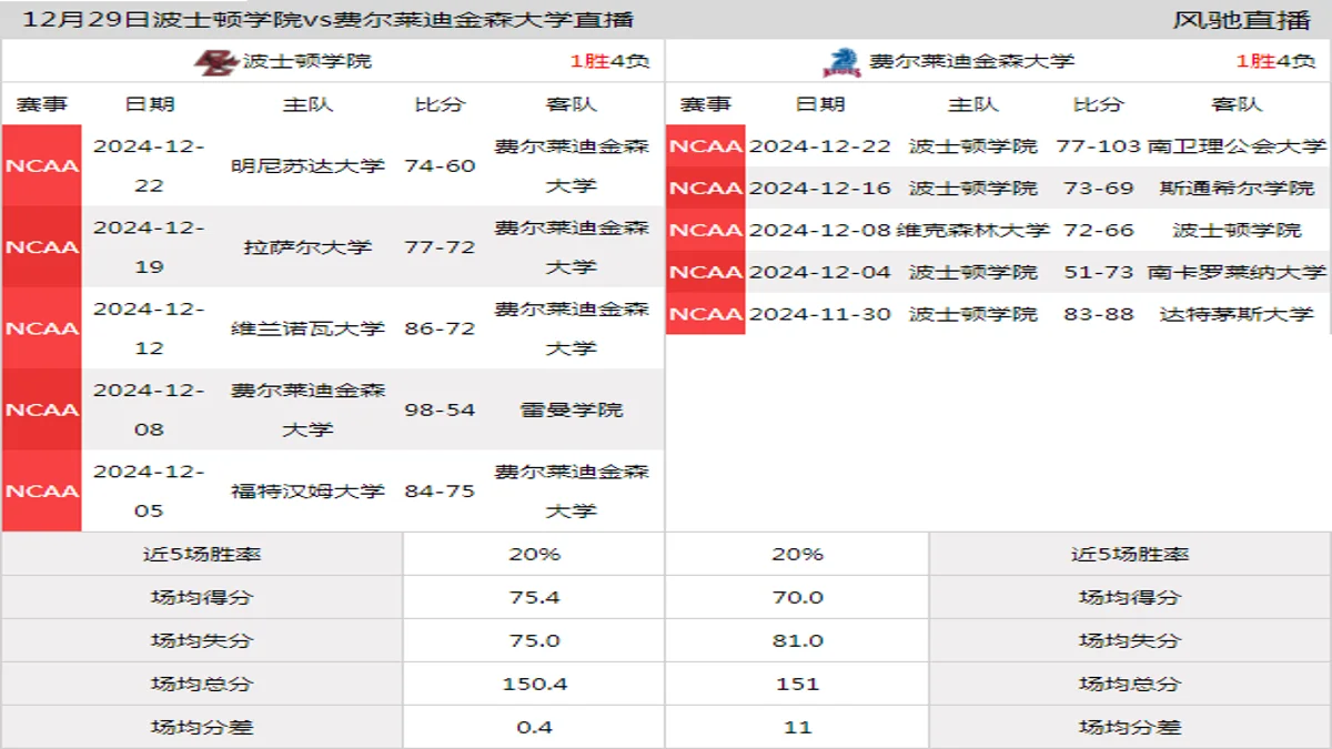 12月29日费尔莱迪金森大学vs波士顿学院直播,比赛数据如下: