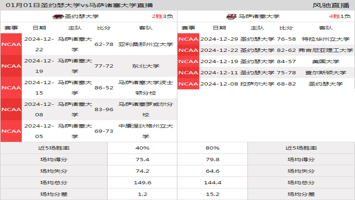 01月01日马萨诸塞大学vs圣约瑟大学直播,比赛数据如下: