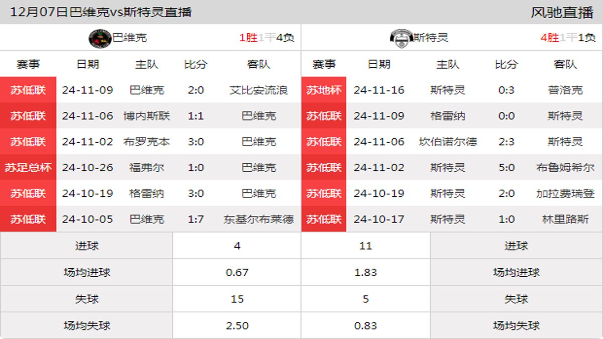 巴维克苏低联斯特灵12月07日巴维克vs斯特灵直播,比赛数据如下: