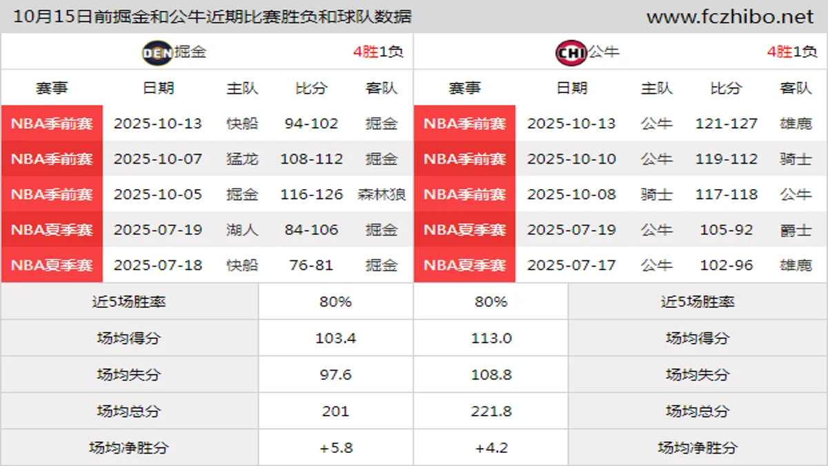 公牛近5场比赛成绩为4胜1负,主场胜3场,输1场(主场胜率为75%),客场赢1场(客场胜率为100%),总胜率为80%。场均得113.0分,失108.8分,总得分为221.8分,净胜+4.2分,最近一次取胜是在10月10日,主场作战以119比112拿下骑士,失利发生在10月13日,在主场以121比127败给雄鹿,这场如果能获胜将阻止两连败发生,并将在10月17日主场对阵森林狼。