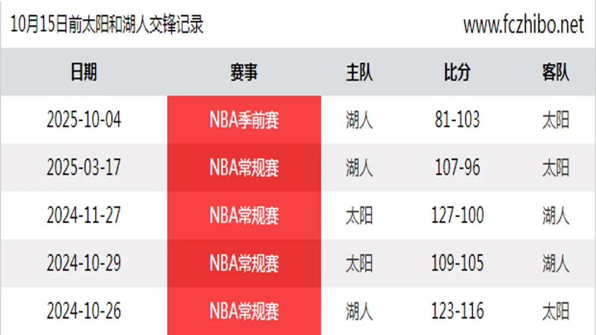 风驰直播10月15日讯 太阳和湖人近5场交锋中,太阳(胜率为60%)取得3场胜利,湖人打赢2场(胜率40%),上一场对决发生在10月4日,湖人主场作战以81比103惨败于太阳,而交手分差最大的一场是在2024年11月27日,太阳主场出战以127比100完胜湖人。